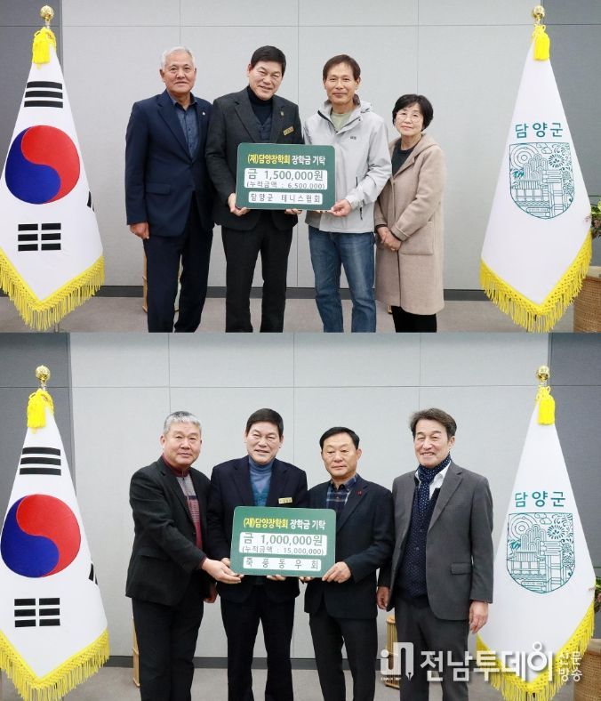 전남투데이 김길룡 기자 | (재)담양장학회는 지난 18일과 19일, 담양군 테니스협회에서 150만 원을, 죽풍동우회에서 100만 원을 지역 인재 양성을 위한 장학금으로 기탁했다고 밝혔다.