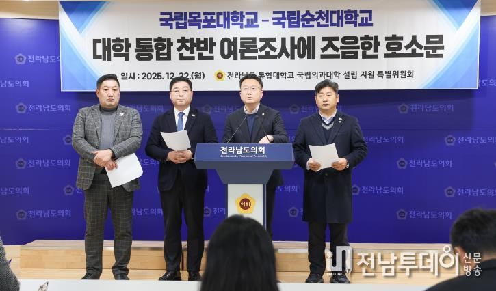 전남투데이 김용희 기자 | 전라남도의회 통합대학교 국립의과대학 설립 지원 특별위원회는 교육부 통폐합 심사위원회 결정을 앞두고 오늘부터(22~23일) 진행 중인 국립목포대학교–국립순천대학교 통합 찬반 투표와 관련해, 양 대학 구성원의 적극적인 관심과 참여를 촉구하는 호소문을 12월 22일 발표했다.