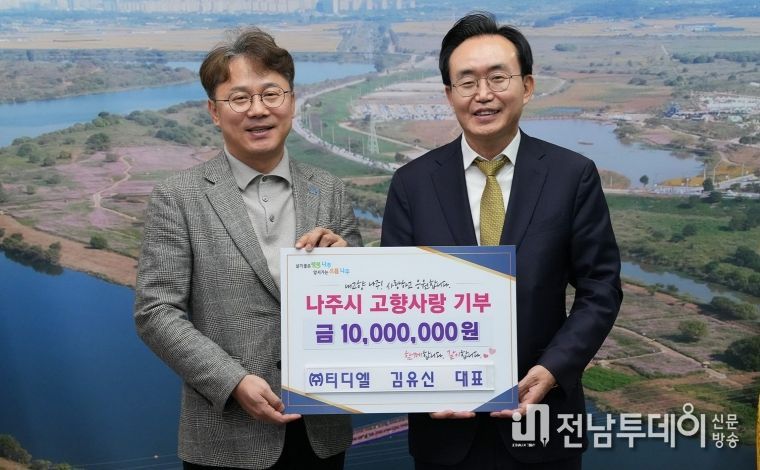 전남투데이 김윤걸 기자 | 전라남도 나주시는 ㈜티디엘 김유신 대표가 지역 발전을 응원하기 위해 고향사랑기부금 1천만 원을 기탁했다고 22일 밝혔다.