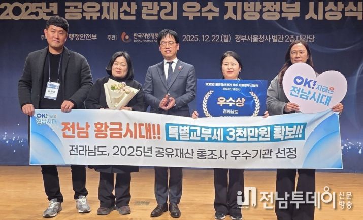 전남투데이 김용희 기자 | 전라남도는 22일 행정안전부 주관 2025년 공유재산 우수지자체 시상에서 공유재산 총조사 분야 우수 지자체로 선정돼 우수상과 함께 특별교부세 3천만 원을 확보했다고 밝혔다. 순천시·구례군·장성군·완도군도 우수기관으로 선정돼 8천만 원의 특별교부세를 확보하는 성과를 거뒀다.