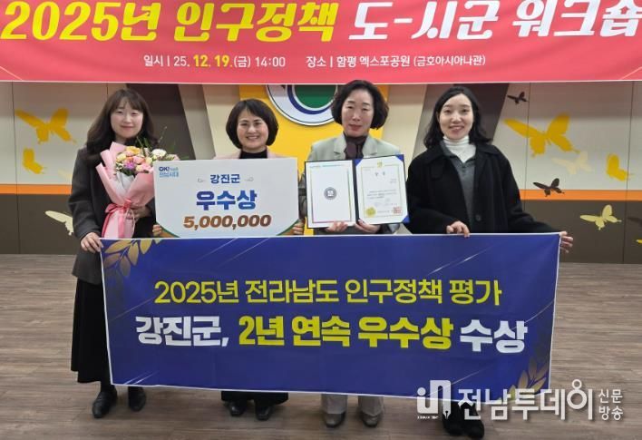 전남투데이 박동운 기자 | 강진군이 전라남도가 실시한 2025년 인구정책 우수 시·군 평가에서 ‘우수상’을 수상했다.