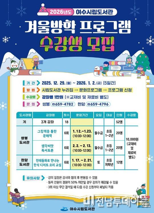 전남투데이 조평훈 기자 | 여수시립도서관은 오는 12월 29일부터 2026년 1월 2일까지 5일간 관내 초등학생을 대상으로 2026년 겨울방학 프로그램 수강생 52명을 선착순 모집한다.