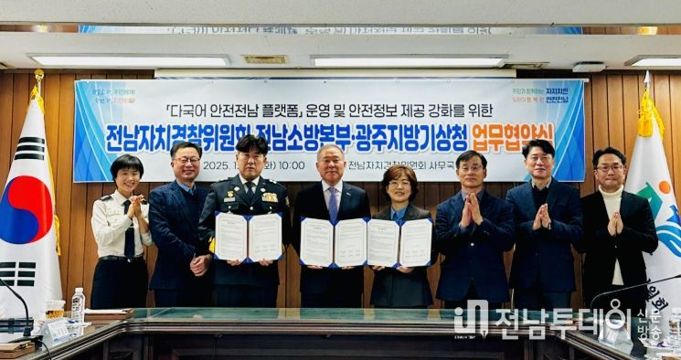 전남투데이 김용희 기자 | 전남자치경찰위원회는 전남소방본부, 광주지방기상청과 지난 23일 업무협약을 해 외국인의 안전한 생활을 보호하고 지원하는 다국어 안전전남 앱 운영과 안전정보 제공을 한층 강화하기로 했다.