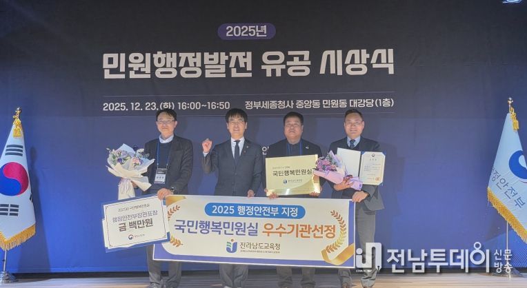 전남투데이 김용희 기자 | 전라남도교육청은 12월 23일 정부세종청사 민원동 대강당에서 열린 ‘국민행복민원실’ 재인증 시상식에 민원업무 관계자들이 참석한 가운데, 행정안전부 장관 표창과 인증현판을 수여받았다.