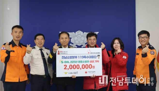 전남투데이 김용희 기자 | 전남119특수대응단(단장 정삼태)은 12월24일 수요일 ‘2025 올해의 영웅소방관’으로 선정된 천영민 소방관의 기부금(2백만원)을 전남사회복지 공동모금회에 전달식을 개최했다고 밝혔다.