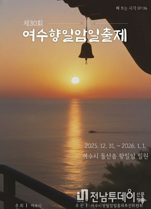 전남투데이 조평훈 기자 | 여수시는 오는 12월 31일부터 2026년 1월 1일까지 전국 4대 관음성지 중 하나이자 남해안 대표 해돋이 명소인 돌산 향일암 일원에서 ‘제30회 여수향일암일출제’를 개최한다고 밝혔다.