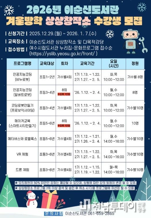 전남투데이 조평훈 기자 | 여수시는 12월 29일부터 2026년 1월 7일까지 ‘2026년 이순신도서관 겨울방학 상상창작소’ 수강생을 선착순 모집한다.