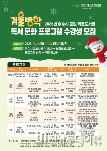 전남투데이 조평훈 기자 | 여수시가 운영하는 5개 공립 작은도서관에서 오는 2026년 1월 5일부터 8일까지 ‘겨울방학 독서문화 프로그램’ 수강생 106명을 선착순 모집한다.