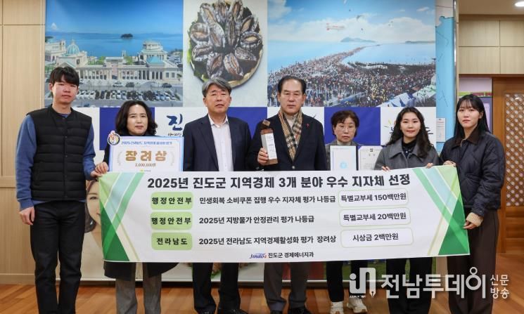 진도군은 ‘민생회복 소비쿠폰 집행 우수 지방자치단체 평가’를 비롯한 지역경제 3개 분야 평가에서 우수 기관으로 선정되며, 특별교부세 1억 7천만 원과 시상금 2백만 원을 확보했다.