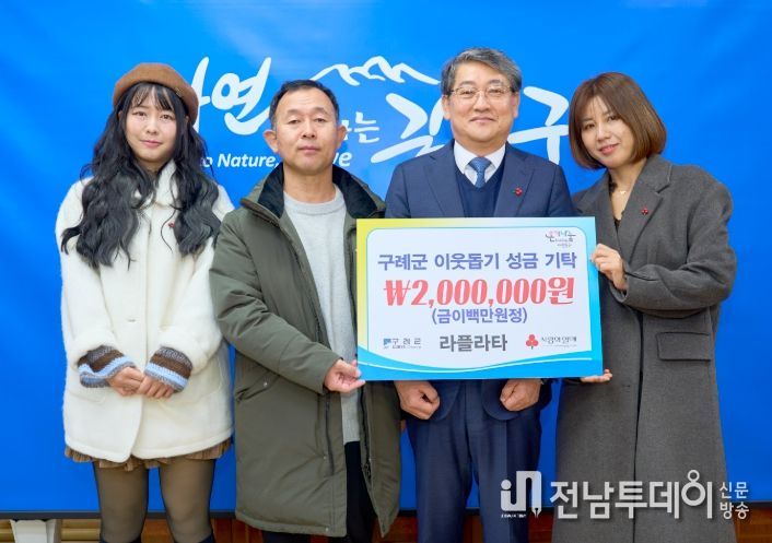 김순호 구례군수는 “해마다 변함없이 이웃사랑을 실천해 주시는 라플라타 김미라 대표님께 깊이 감사드린다”며 “이러한 따뜻한 나눔이 지역사회 전반에 희망을 전하는 큰 힘이 되고 있다”고 말했다.