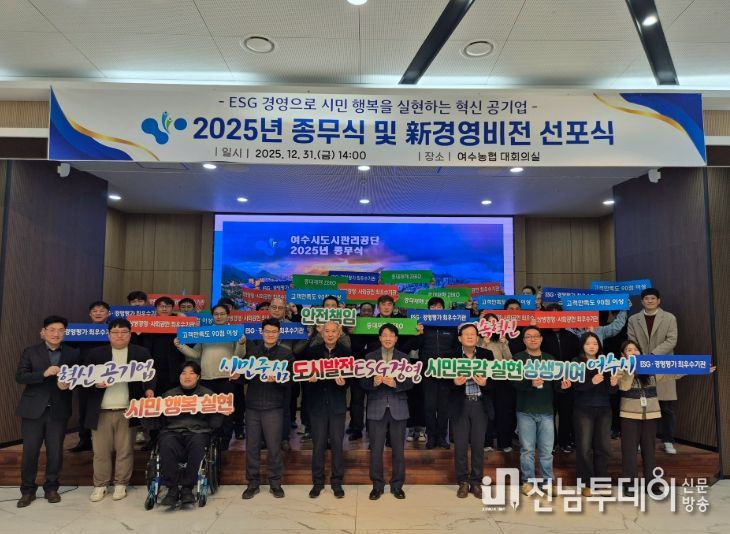 전남투데이 조평훈 기자 | 여수시도시관리공단은 31일 공단 대회의실에서 ‘新 경영비전 선포식’을 개최하고, 향후 5년간 공단이 나아갈 새로운 경영 철학과 조직 혁신 의지를 대내외에 공식적으로 밝혔다.