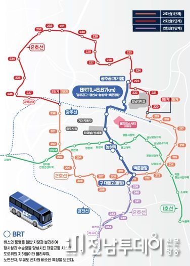 전남투데이 김경민 기자 | 광주시가 대규모 도시개발로 교통 혼잡이 예상되는 광천권역에 도입하는 ‘백운~매곡 간선급행버스체계(BRT)’ 구축 사업을 올해 본격 추진한다.