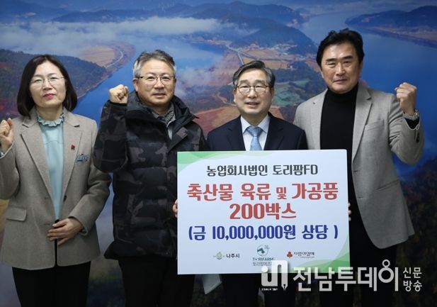 나주시(시장 윤병태)는 지난달 30일 농업회사법인 토리팜FD(대표 최원준)가 관내 취약계층 지원을 위해 삼겹살, 목살, 앞다릿살 등 축산물 가공품 200박스(1천만 원 상당)를 기탁했다고 2일 밝혔다.