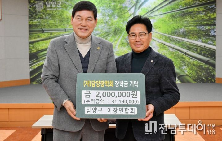 전남투데이 김길룡 기자 | (재)담양장학회는 지난 6일 담양군 이장연합회(회장 정용오)에서 지역인재 육성을 위한 장학금 200만 원을 기탁했다고 밝혔다.