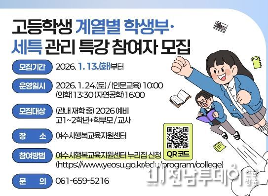 전남투데이 조평훈 기자 | 여수시가 오는 1월 24일 관내 예비 고1, 2학년과 학부모·교사를 위해 여수시행복교육지원센터에서 미리 준비하는 ‘계열별 학생부‧세특 관리 특강’을 운영한다.