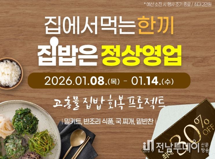 전남투데이 조평훈 기자 | 고흥군이 운영하는 온라인 농수축특산물 쇼핑몰 ‘고흥몰’이 가정 내 식사를 보다 간편하고 실속 있게 즐길 수 있도록 돕기 위해 집밥 중심 기획전을 운영한다.