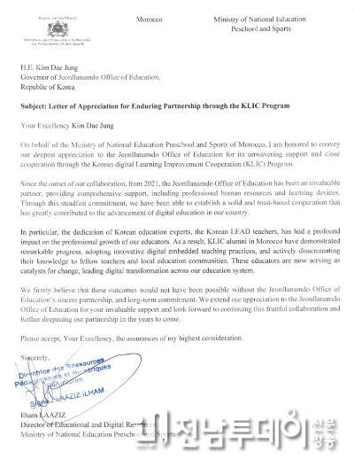 이번 감사 서한은 전라남도교육청이 2021년부터 교육 정보화 지원 사업 (KLIC‧Korean Digital-Learning Improvement Cooperation)을 통해 모로코 교육부와 디지털 교육 분야에서 지속적인 협력을 이어온 데 대한 평가를 담고 있다.