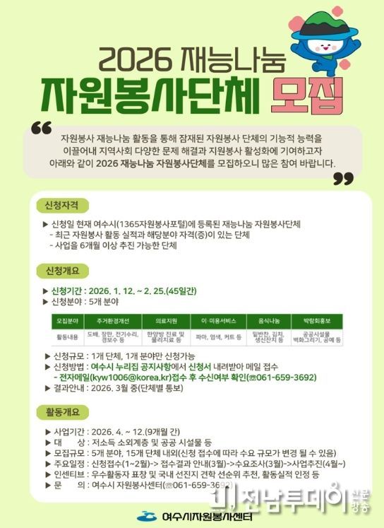 전남투데이 조평훈 기자 | 여수시는 오늘(12일)부터 오는 2월 25일까지 ‘2026년 찾아가는 재능나눔 프로그램’에 참여할 자원봉사 단체를 모집한다.