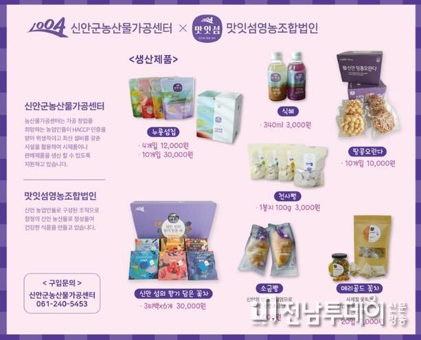 맛잇섬영농조합법인은 농산물가공센터를 거점으로 신안군의 우수 농수특산물을 활용한 누룽섬칩, 퍼플식혜, 신안땅콩강정, 꽃차, 신안소금빵 등 7개 유형 32품목의 가공식품을 제조·판매하고 있으며, 현재 가공창업을 희망하는 조합원 27명이 활발히 활동 중이다.