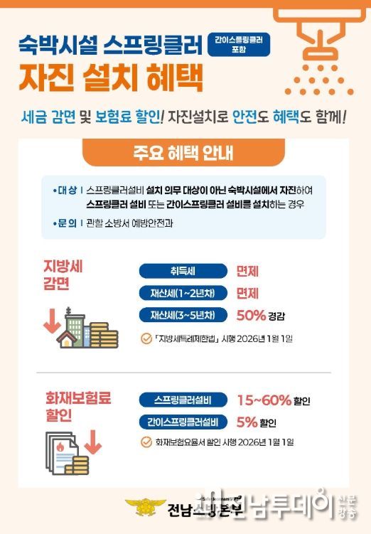 전남투데이 김용희 기자 | 전라남도소방본부는 2026년 1월 1일부터 숙박시설이 자발적으로 스프링클러 등 소방시설을 설치할 경우 지방세 감면과 화재보험료 할인 혜택을 제공한다고 밝혔다.