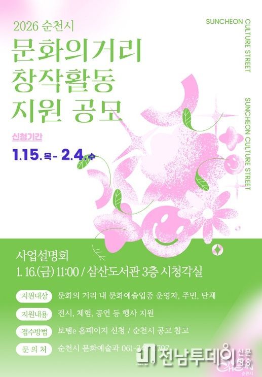 전남투데이 조평훈 기자 | 순천시는 문화의 거리를 예술특화 거점지역으로 육성하고 지역 예술인의 지속가능한 창작활동을 지원하기 위해 ‘2026년 순천시 문화의 거리 창작활동 지원사업’ 참여자를 공개 모집한다고 밝혔다.