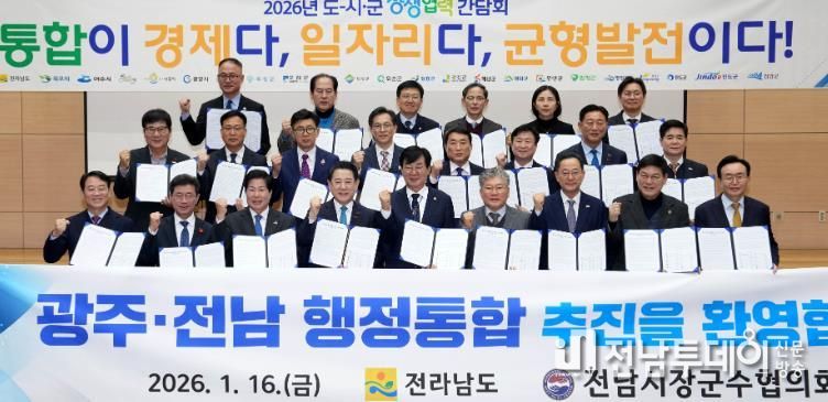 전남투데이 김용희 기자 | 전라남도는 16일 전남도청 왕인실에서 ‘2026년 도-시군 상생협력 간담회’를 열어 지역 대도약을 위한 광주·전남 행정통합 추진에 도와 22개 시군이 공동 보조를 맞추기로 했다.