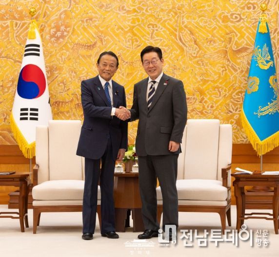 전남투데이 정홍균 기자 | 이재명 대통령은 16일 16시부터 약 30분간 '서울-도쿄 포럼' 참석차 방한한 아소 다로(麻生 太郎) 전 일본 총리를 접견하고, 이번 주 진행된 나라(奈良) 방문(1.13.-14.)과 한일 정상회담 결과 등에 대해 이야기를 나누었다.