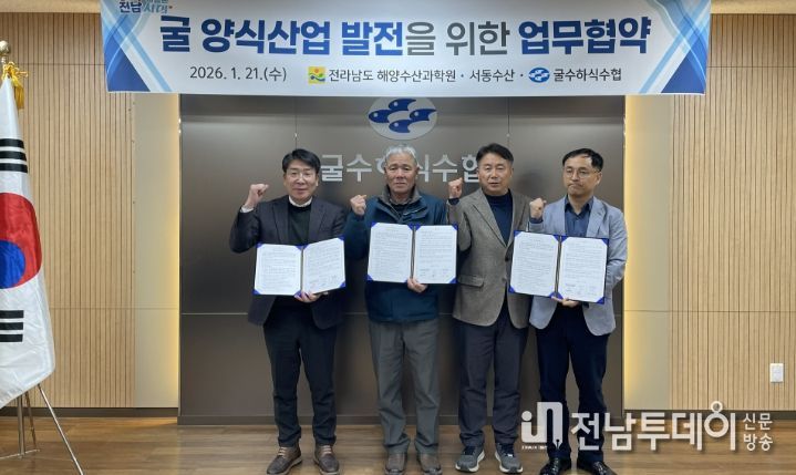 전남투데이 김용희 기자 | 전라남도해양수산과학원 동부지부 여수지원은 21일 굴수하식수협, 굴 양식어업인과 기후변화 대응 굴 생산성 향상과 양식구조 개선 공동 연구를 위한 업무협약을 했다.