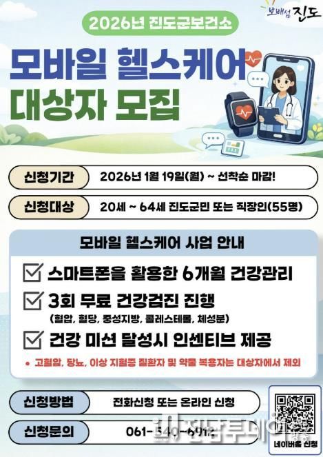 전남투데이 문경식 기자 | 진도군은 지난 19일부터 군민들이 건강한 생활 습관을 형성할 수 있도록 ‘2026년 모바일 헬스케어 1기’ 대상자 55명을 선착순으로 모집하고 있다.