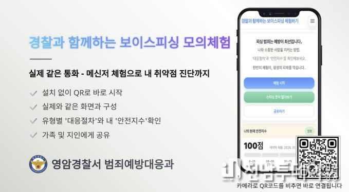 전남투데이 박상훈 기자 | 영암경찰서는 보이스피싱·메신저피싱 등 피싱 범죄를 실제처럼 체험하고, 체험 직후 개인별 위험도를 진단해 반복 학습까지 가능한 ‘보이스피싱 예방 모의 체험’ 웹-어플을 개발해 홍보에 나섰다.
