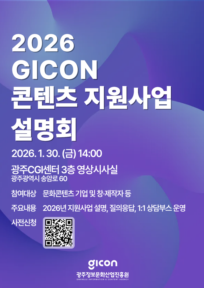 전남투데이 김경민 기자 | (재)광주정보문화산업진흥원(원장 이경주, 이하 GICON)은 오는 1월 30일 오후 2시, 광주CGI센터 3층 영상시사실에서 '2026년 GICON 콘텐츠 지원사업 설명회'를 개최한다고 밝혔다.