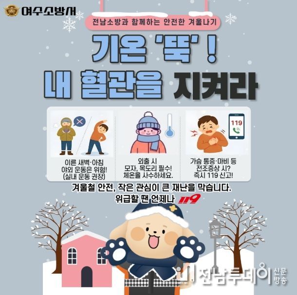 전남투데이 조평훈 기자 | 여수소방서(서장 서승호)는 겨울철 한파로 인한 각종 안전사고를 예방하고 시민들의 건강을 보호하기 위해 겨울철 생활안전수칙 집중 홍보에 나섰다고 밝혔다. 이번 캠페인은 기온 급강하로 인해 발생할 수 있는 심뇌혈관 질환, 저체온증 등 건강 피해를 예방하고 안전한 겨울나기를 돕기 위해 마련됐다.