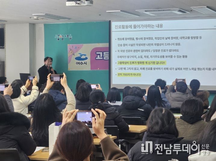 전남투데이 조평훈 기자 | 여수시가 지난 24일 여수시행복교육지원센터에서 관내 고등학생과 학부모, 교사를 대상으로 ‘계열별 학생부‧교과별 세부특기사항(세특) 관리 특강’을 개최해 큰 관심과 호응을 얻었다.