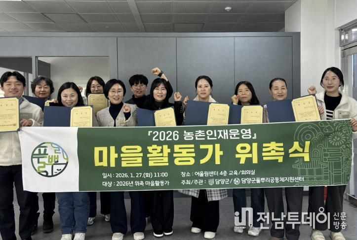 군은 지난 27일 담양군 어울림센터에서 ‘2026년 마을활동가 위촉식’을 열고, 공개 모집과 면접 심사를 거쳐 선발된 활동가들에게 위촉장을 수여했다.