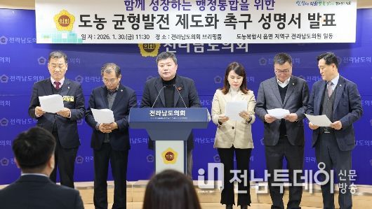 전남투데이 김용희 기자 | 전라남도의회 도농복합시 농어촌 지역구 도의원들이 전남·광주 행정통합과 관련해, 도농 균형발전을 제도적으로 보장할 것을 촉구하고 나섰다.