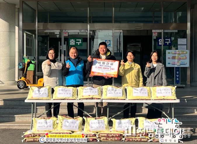 전남투데이 조평훈 기자 | 광양시 광양읍지역사회보장협의체(공공위원장 김미란, 민간위원장 송근배)는 비엘건설(대표 박성배)이 지난 1월 2일과 2월 2일, 두 차례에 걸쳐 백미 300kg(150만 원 상당)씩 총 600kg(300만 원 상당)을 기탁했다고 밝혔다.