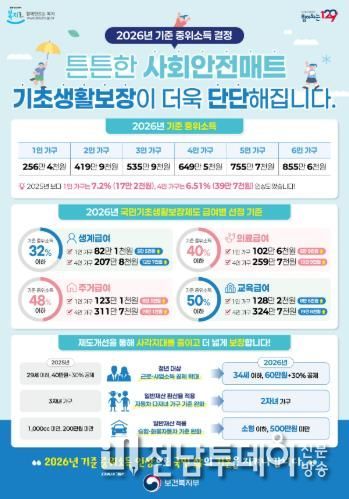 정광선 전남도 보건복지국장은 “2026년 기준중위소득 인상과 제도 개선을 통해 8천700여 가구가 기초생활 보장을 받게 됐다”며 “앞으로도 생활이 어려운 도민의 삶의 질 향상을 위해 제도개선 활성화로 더 촘촘하고 안전한 복지망을 만들겠다”고 말했다.