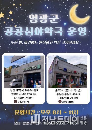 전남투데이 박세훈 기자 | 영광군은 오는 2월 9일부터 공공심야약국 2개소를 지정하여 매일 오후 8시부터 11시까지 운영한다고 밝혔다.