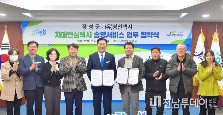 군은 4일 군청 상황실에서 (유)영천택시와 ‘치매안심택시 송영 서비스’ 운영을 위한 업무 협약을 체결했다. 김한종 장성군수, 정귀우 (유)영천택시 대표 등 관계자 10여 명이 참석했다.