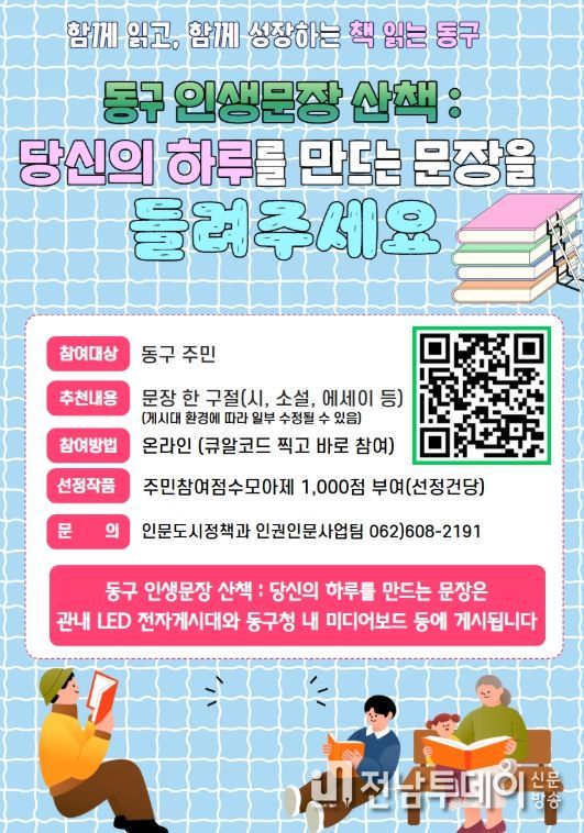 전남투데이 김경민 기자 | 광주 동구는 주민과 함께 읽고, 함께 성장하는 독서문화 확산과 비독서층의 독서 입문을 지원하기 위해 ‘책 읽는 동구’ 사업 일환인 ‘동구 인생문장 산책:당신의 하루를 만드는 문장’ 프로그램을 연중 운영한다고 밝혔다.