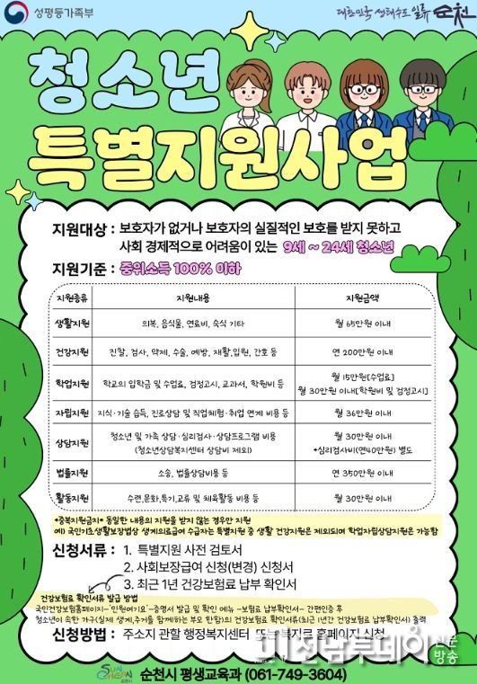 전남투데이 조평훈 기자 | 순천시는 청소년의 건강한 성장지원 및 자립을 지원하고자 오는 27일까지 ‘청소년 특별지원 사업’ 대상자를 모집한다고 밝혔다.