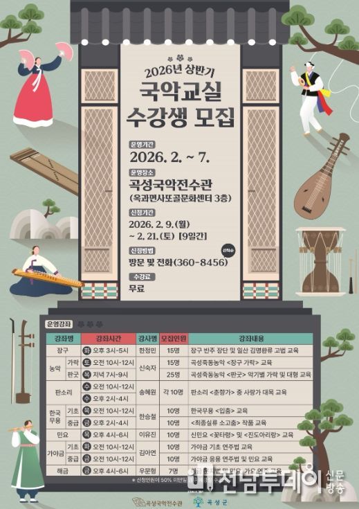 전남투데이 정홍균 기자 | 전남 곡성군은 곡성국악전수관에서 운영하는‘2026년 상반기 국악교실’수강생을 모집한다고 6일 밝혔다.
