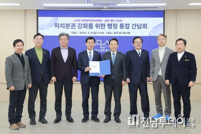 광주광역시구청장협의회는 8일 광주 동구청에서 대전광역시 중구청장·유성구청장과 함께 신정훈 국회 행정안전위원장과 간담회를 갖고, 광역 행정통합 추진 방향과 관련해 자치구의 자치권이 실질적으로 보장될 수 있도록 통합특별법에 반영해 줄 것을 건의했다고 밝혔다.