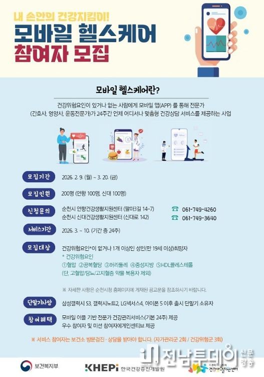 전남투데이 조평훈 기자 | 순천시는 ICT 기반 공공형 건강관리서비스인 ‘2026년 보건소 모바일 헬스케어 사업’ 참여자를 모집한다고 밝혔다.