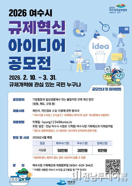전남투데이 조평훈 기자 | 여수시는 오늘(10일)부터 3월 31일까지 법령이나 조례 등에 과도한 규제로 시민의 일상생활에 불편을 주거나 기업 경영활동에 걸림돌이 되는 불합리한 사항을 발굴·개선하기 위해 “2026년 여수시 규제혁신 아이디어 공모전”을 실시한다.