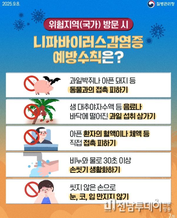 전남투데이 김용희 기자 | 전라남도는 설 연휴기간 해외 여행객 증가가 예상됨에 따라 최근 인도 등 일부 국가에서 발생한 ‘니파바이러스감염증(Nipah virus infection)’에 대해 각별한 주의를 당부했다.