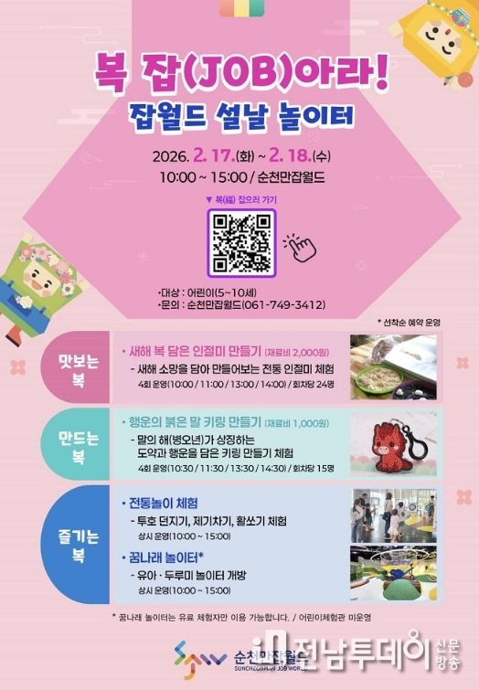 전남투데이 조평훈 기자 | 순천시는 오는 17일부터 18일까지 설날 연휴를 맞아 순천만잡월드에서 ‘복 잡(JOB)아라! 잡월드 설날 놀이터’ 이벤트를 개최한다고 밝혔다.