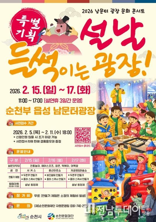 전남투데이 조평훈 기자 | 순천시는 설 연휴를 맞아 ‘설날, 들썩이는 광장!’ 행사를 오는 15일부터 17일까지 3일간, 오전 11시부터 오후 5시까지 순천부 읍성 남문터 광장에서 개최한다고 밝혔다.