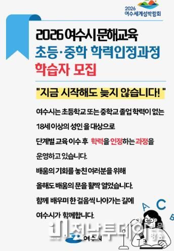 전남투데이 조평훈 기자 | 여수시는 배움의 시기를 놓쳤다고 느끼는 시민들을 위한 초·중등 학력인정 평생교육과정 ‘학교의 문’을 열고 학습자를 모집한다고 밝혔다.