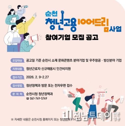 지원 인원은 총 85명으로 모집 기간은 2월 9일부터 27일까지이며, 자세한 사항은 순천시청 누리집 또는 청년정책114 홈페이지를 참고하거나 순천시청 청년정책과 청년일자리팀으로 문의하면 된다.